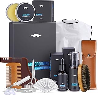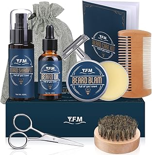 Kit Barbe Homme,Y.F.M, 8Pcs Kit d’Entretien de Barbe, Shampooing Barbe, Huile à Barbe, Baume Barbe,Rasoir Manuel,Ciseaux, Peigne Barbe,Brosse à Barbe avec Sac, Cadeau Coffret pour Papa/Mari/Amis