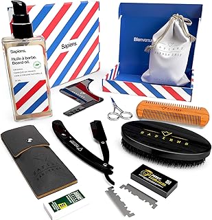 Kit barbe homme Sapiens Barbershop - Huile barbe Made in France, Rasoir coupe choux + 10 Lames Derby, Brosse barbe, Peigne barbe, Ciseaux barbe, Pochoir, Pochette - Coffret soin barbe et rasage homme